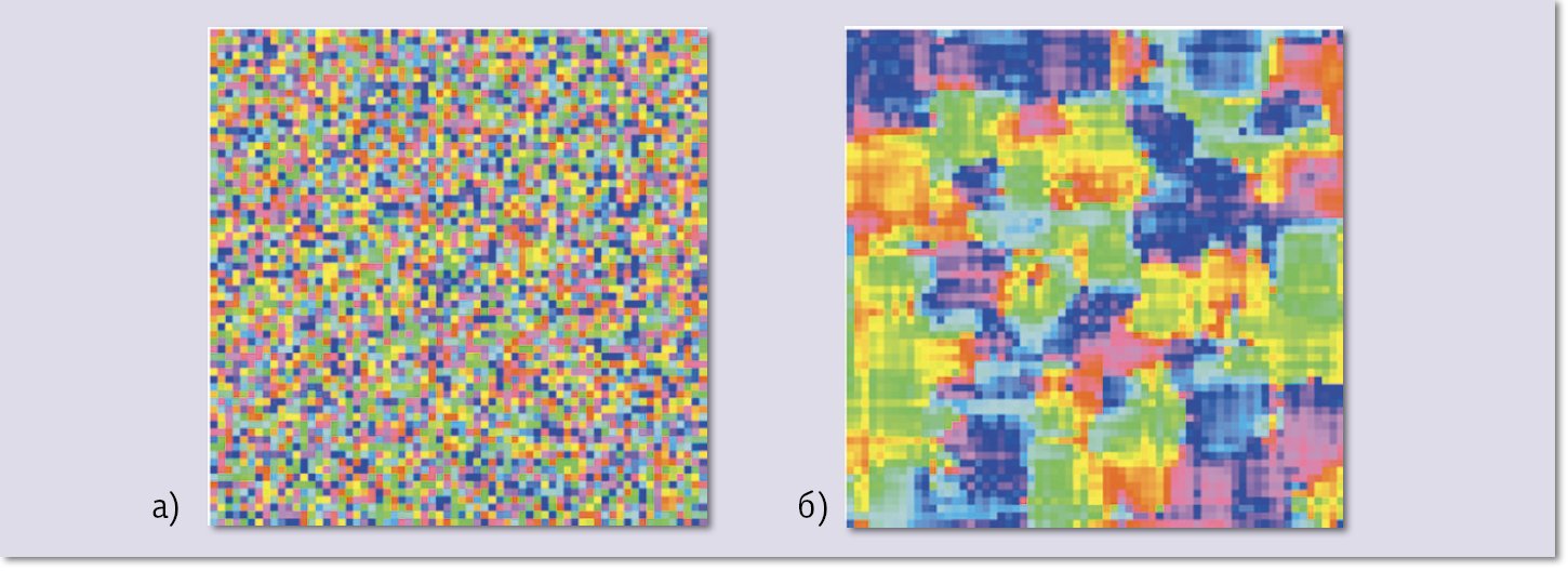 | Рис. 7. Топографическая карта ориентационной избирательности. (а) Перед обучением нет идентифицируемых кластеров ориентационной избирательности. (б) Кластеры появляются после обучения; различные цвета соответствуют различным ориентациям |