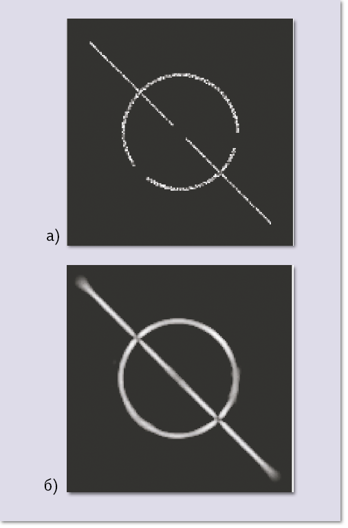 | Рис. 9. Простое завершение контуров. (а) Зашумленная фигура, состоящая из разорванного отрезка и окружности, восстанавливается при помощи алгоритма завершения контуров, реализованного средствами Cog, и (б) становится четкой |