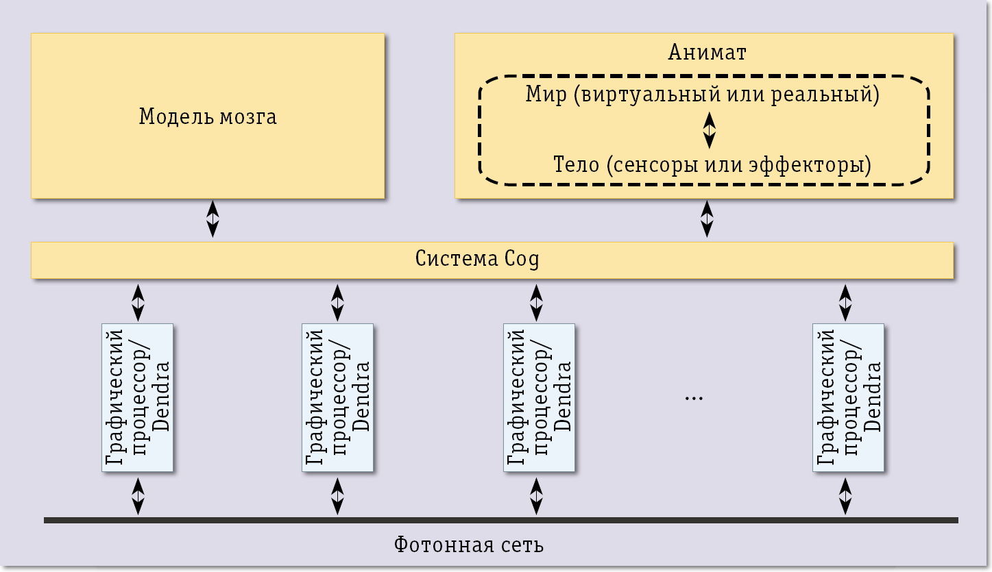 | Рис. 1. Общая схема платформы Cog Ex Machina. Аппаратная часть состоит из ускорительных узлов (в качестве которых сейчас применяются графические процессоры, а со временем будут использоваться чипы Dendra), общающихся по фотонной сети. Исследователи строят абстрактные модели мозга на платформе Cog. Модели мозга используют Cog для взаимодействия с реальным миром посредством сенсоров и эффекторных устройств либо с виртуальным миром через анимат — виртуальную реализацию робота |