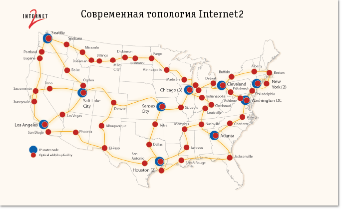 В 1996 году силами 34 научных учреждений была создана Internet2, сеть, задуманная как более быстрая и совершенная, чем Интернет. Задачами проекта было обеспечить надежную выделенную пропускную способность для нужд исследований и образования, а также разработать технологии, которые бы позволили усовершенствовать «обычный» Интернет. Сегодня наблюдатели сходятся во мнении, что первая из этих задач выполнена: создана сеть с оптической магистралью, максимальная пропускная способность которой – 400 Гбит/с. К ней подключены 20 региональных сетей, которые обеспечивают доступ для более 66 тыс. учреждений, в том числе музеев, библиотек, школ, медицинских центров. Благодаря Internet2 американские ученые участвуют в исследованиях, осуществляемых с использованием Большого адронного коллайдера. Однако вторая задача, как считает директор по ИТ-безопасности Гарвардского университета Скотт Брэднер, решена лишь отчасти: достигнуты успехи в ряде оригинальных исследовательских проектов, но часть из них оказалась напрасной. Например, разрабатывавшиеся в Internet2 технологии повышения качества обслуживания оказались ненужными, когда значительно выросли скорости обычного Интернета.