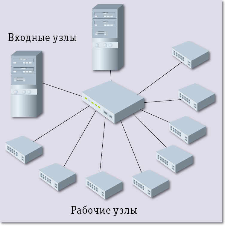 - обычные узлы на входе и рабочие (wimpy) узлы;