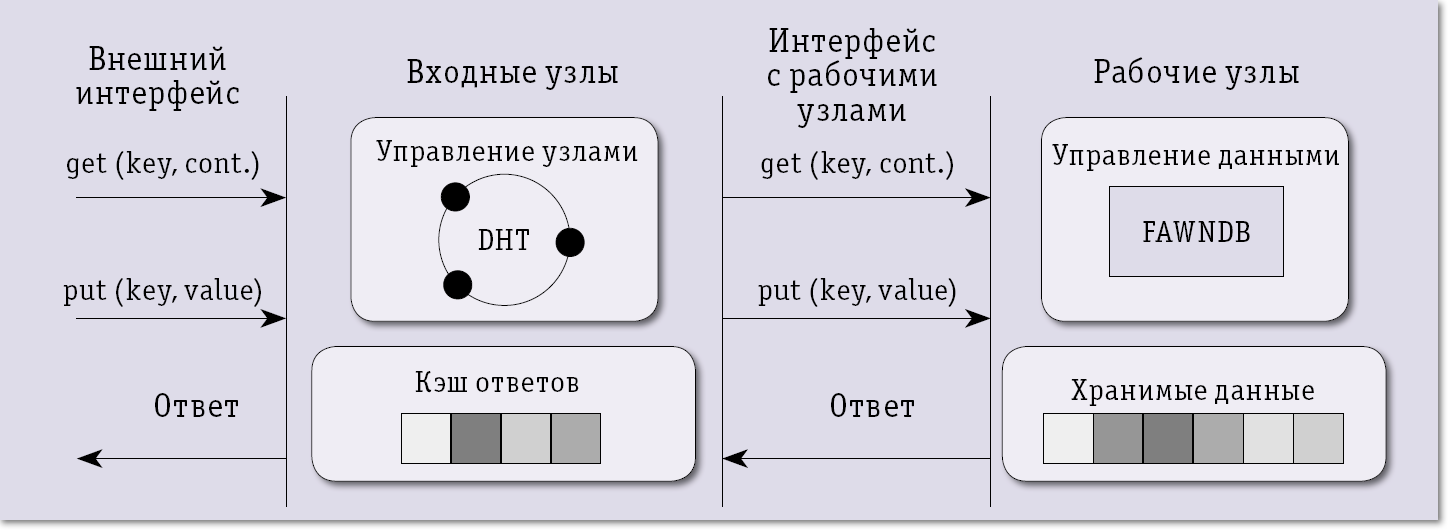 На рис. 2 представлена функциональная схема FAWN. Для взаимодействия клиента с FAWN используется интерфейс с командами get и put. Если запросы достаточно просты, то они могут быть обработаны непосредственно на входных серверах без обращения к рабочим. Рабочие узлы связывает сложный алгоритм взаимодействия, в основе которого лежит деление физических узлов на виртуальные, а также кольцевая организация, при которой виртуальные узлы разных физических узлов резервируют друг друга, образуя структуры, названные группами реплицирования. Команды get и put с использованием 160-разрядных идентификаторов адресуются в такие группы. Резервирование делает незаметным выход из строя того или иного узла. Для повышения скорости обмена используется двухуровневая система кэширования, где нижний уровень располагается на самом узле, а верхний объединяет отдельные узлы.