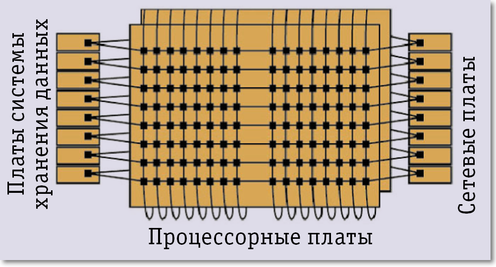 Соответствие типу нагрузки в SM10000 обеспечивают две микросхемы. Одна предназначена для сбора процессоров Atom в многомерный тор с пропускной способностью 1,28 Тбит/с и обеспечения коммутации к каждому из ядер на скорости 2,5 Гбит/с (рис. 3). Она же выполняет функции сетевых контроллеров и контроллеров систем хранения данных, что упрощает работу операционной системы Linux на узлах и исключает необходимость в драйверах.