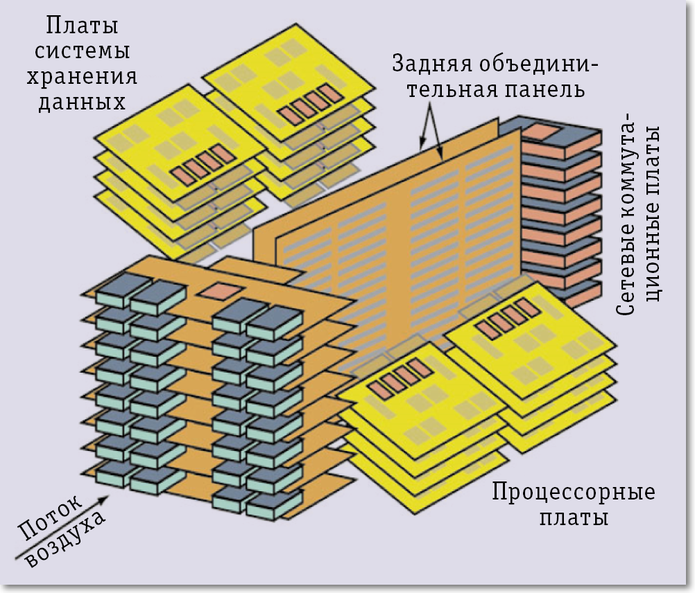 В SM10000 все собрано воедино: обработка данных, их хранение, коммутация, управление серверами и балансировка нагрузки. За счет этого сервер занимает одну четверть объема и потребляет одну четверть энергии, потребляемой традиционными системами такой же производительности. SM10000 целиком состоит из 64 серверных карт, восьми карт хранения данных и карт Ethernet. В стандартном исполнении сервер имеет высоту 10U и потребляет 2 кВт. В стандартную стойку можно установить четыре таких модуля и получить систему из 2048 процессоров. Серверная плата построена на одноядерном Atom Z530/1,6 ГГц с памятью DDR2 емкостью 1 или 2 Гбайт, при виртуализации можно получить гранулы меньшего размера. Физические размеры серверной платы SM10000 равны размерам стандартной кредитной карты, их достаточно для установки восьми процессоров, чипсета, памяти и специализированной микросхемы. На материнскую плату устанавливается восемь таких плат, и 64 материнские платы устанавливаются в стойку, таким образом получается общее число 512 процессоров Atom. На каждой из восьми карт системы хранения находится восемь современных 2,5-дюймовых дисков SATA с возможностью горячей замены и создания конфигураций RAID. Всего на SeaMicro SM10000 может быть установлено до 64 жестких дисков SATA диаметром 2,5 дюйма или устройств SSD. При желании от внутренних дисков можно отказаться и использовать внешние системы хранения. Диски (физические или виртуальные) могут быть сконфигурированы так, что только один из 512 узлов имеет полномочия на чтение и запись, а остальные 511 — только на чтение, возможно и иное распределение. Смысл этого действия в том, что локализация прав записи упрощает процедуры модернизации ПО в ЦОД, пзволяя выполнять их на ограниченном числе дисков. Карты Ethernet поддерживают до восьми портов 1 Гбит/с или до двух портов 1 Гбит/с. Все эти карты объединены в трехмерный тор (рис. 3) коммутационной системой, обеспечивающей суммарную производительность 1,28 Тбит/с и к каждому из ядер 2,5 Гбит/с. Вся конструкция сервера SeaMicro SM10000 (рис. 4) поддерживает все виды дистанционного управления, но в нем нет коррекции кодов при доступе к памяти ECC, что может ограничить его применение в ответственных корпоративных приложениях.