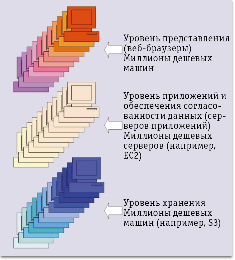 Взамен традиционной архитектуры системы баз данных с серверами баз данных и приложений предлагается новая архитектура (рис. 1), реализованная компанией 28msec в продукте Sausalito. В этой архитектуре основные функции СУБД — обработка запросов и управление транзакциями — переносятся на прикладной уровень, а на нижнем поддерживается только распределенное хранение данных с применением службы Amazon S3, хотя теоретически можно использовать и другие аналогичные средства. Согласованность данных поддерживается не на уровне хранения, а на прикладном уровне. Отсутствует какой-либо объект, контролирующий весь доступ к данным, и согласованность данных обеспечивается за счет применения во всех серверах приложений общих протоколов в духе Amazon S3 (протоколы направлены на поддержку согласованности реплик данных, так что здесь имеется в виду именно этот вид согласованности).