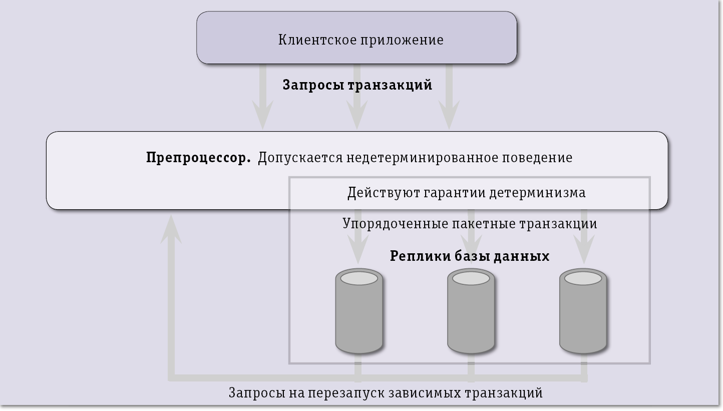 Эксперименты авторов показывают, что, если возможны длительные задержки при выполнении какой-либо транзакции, то детерминированная схема приводит к быстрому "загромождению» системы блокированными транзакциями и резкому падению производительности. Поэтому, в частности, детерминированная схема непригодна для СУБД, работающих с базами данных в дисковой памяти. Однако в системах, обрабатывающих данные исключительно в основной памяти, ситуация меняется. В ряде случаев детерминизм позволяет повысить производительность, упрощая при этом репликацию и избавляя от потребности в двухфазном протоколе фиксации распределенных транзакций.