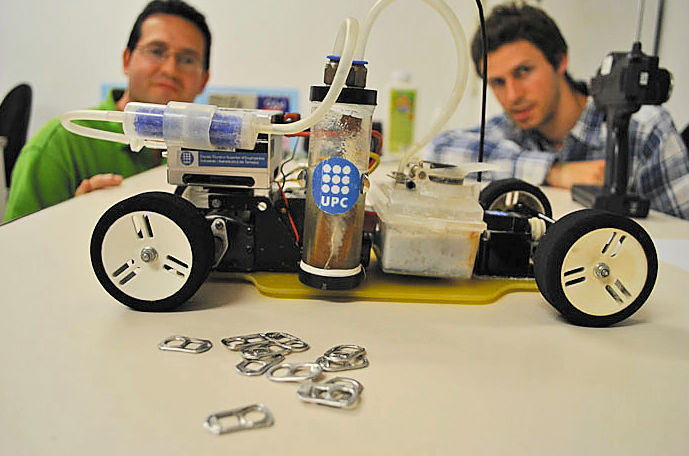 Топливом для радиоуправляемого автомобиля, сконструированного студентом и преподавателем Политехнического университета Каталонии, служат... алюминиевые банки из-под напитков. В результате реакции алюминия с каустической содой выделяется водород, который используется как горючее для топливной батареи, питающей двигатель. Автомобиль развивает скорость до 30 км/ч.