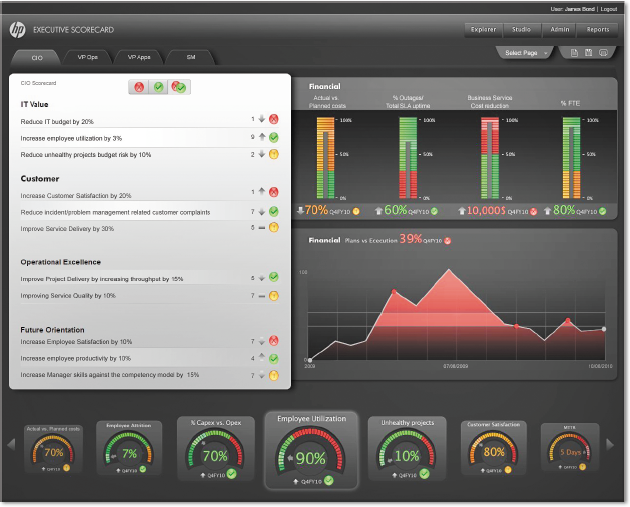 Компания Hewlett-Packard представила приложение, способное наглядно отображать широкий диапазон индикаторов результативности, подсчитанных на основе данных из различных программных систем HP. Как объясняют в компании, идея приложения в том, чтобы объединить в общий срез данные по операциям и управлению и тем самым обеспечить возможность измерять и оптимизировать показатели по всему портфелю используемого ПО. Например, Executive Scorecard позволяет одновременно следить и за финансовым состоянием ИТ-проекта, и за его соответствием графику исполнения.