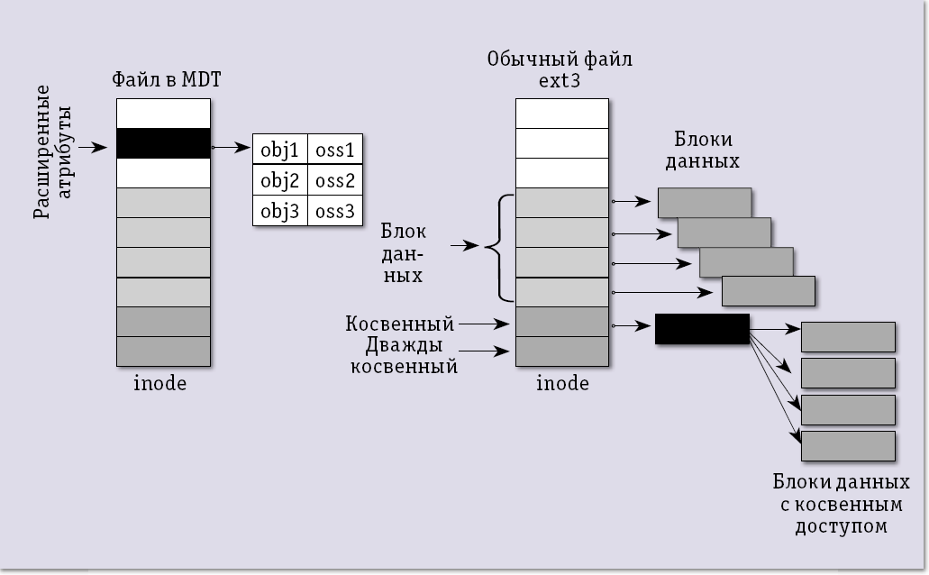 Lustre интерпретирует любые файлы как объекты, доступ к которым обеспечивается посредством MDS, осуществляющих все операции, связанные с пространством имен, в том числе такие, как поиск файлов, создание и уничтожение файлов, работа с каталогами. Реальное выполнение операций ввода-вывода перепоручается объектному хранилищу OST, которое в свою очередь оперирует входящими в его состав объектными дисками (Object-Based Disk, OBD). Кроме того, серверы метаданных поддерживают транзакционные записи об изменениях метаданных и состоянии кластера, а также контролируют свою собственную работоспособность таким образом, чтобы выход из строя одного MDS не повлиял на работоспособность файловой системы в целом. В Lustre, как и в большинстве других файловых систем, каждый обычный (регулярный) или специальный файл, каталог и символическая связь идентифицируются уникальным индексным дескриптором inode. Однако и в этом проявляется самобытность Lustre, дескрипторы регулярных файлов связаны не с самими файлами, а с объектами в хранилищах OST, поэтому здесь для создания нового файла клиент обращается к серверу MDS, который создает inode, а затем вступает в контакт с OST для создания объекта, хранящего данные. Если нужно внести изменения в пространство имен, то объект может быть распределен между несколькими OST для создания образа RAID.