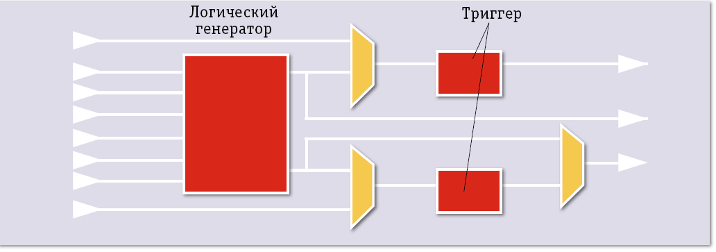 Базовый элемент FPGA – логическая ячейка (рис. 1), содержащая логический генератор и триггеры. Логический генератор – «визитная карточка» FPGA – блок статической памяти, заполненной таблицей выходных значений. Для шести входов возможны 64 комбинации входных сигналов, таким образом, для реализации логического генератора требуется 64 бит памяти. Получается, что внутри FPGA расположены не базовые логические элементы И, ИЛИ, НЕ и т. п., а таблицы значений, с помощью которых можно имитировать любую комбинацию этих элементов. Выходы логических генераторов могут быть записаны в триггер, а могут быть и пущены в обход его, что позволяет при наличии достаточного количества логических ячеек-«кубиков» построить цифровую схему практически любой сложности.