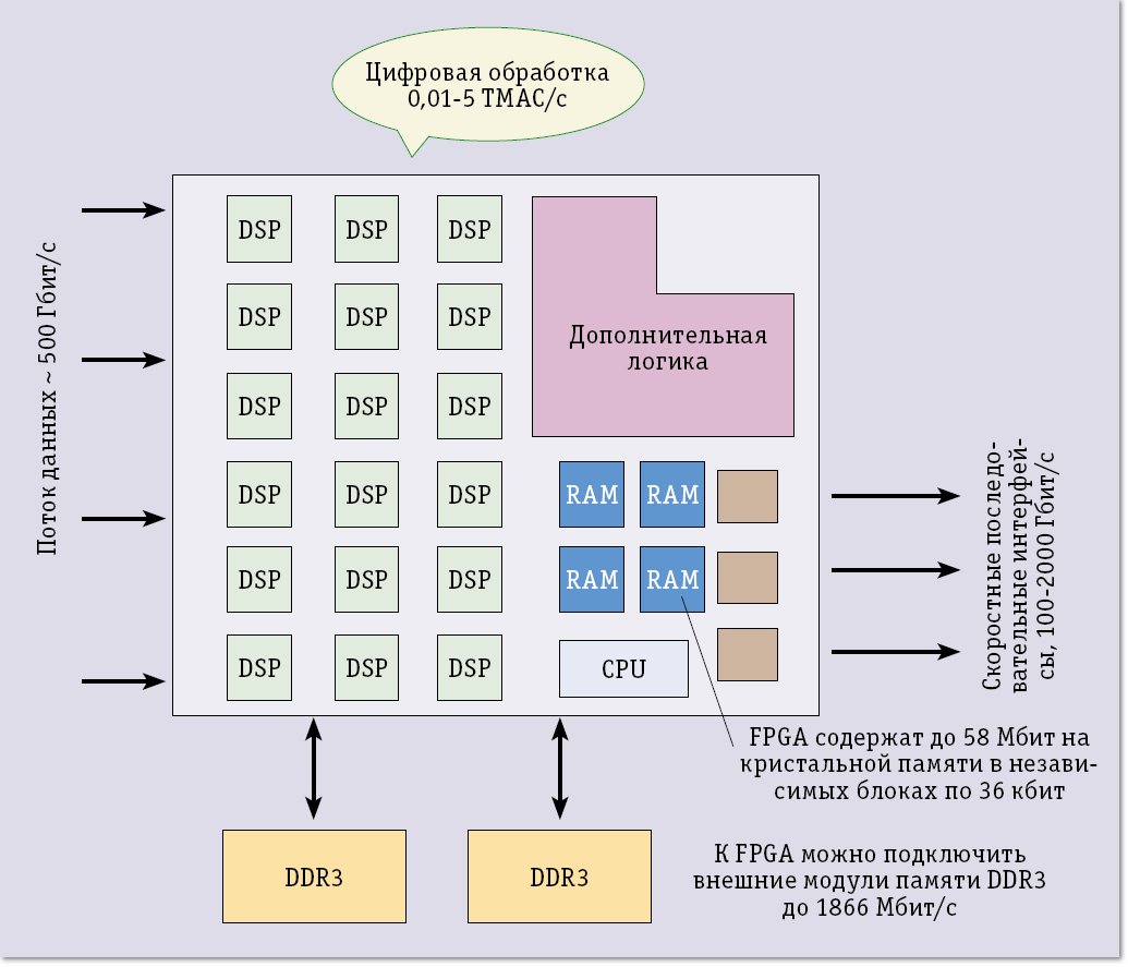 Блоки цифровой обработки сигналов – не единственный аппаратный компонент в FPGA, на рис. 2 можно также увидеть блочную память и приемопередатчики. Первый из компонентов часто выступает как органичное дополнение блоков цифровой обработки сигналов, поскольку для многих алгоритмов требуется хранение обрабатываемых данных или дополнительных коэффициентов. Это обычная статическая память, аналогичная кэш-памяти процессоров. По аналогии с блоками цифровой обработки, появление такой памяти связано с тем, что реализовать ее с помощью программируемых ячеек возможно, но очень накладно – характеристики такого блока будут далеки от оптимальных, а расход программируемых ресурсов чрезвычайно высок. Объем блоков памяти, однако, не так велик и составляет до 85 Мбит (хотя в FPGA приемлемой стоимости можно ожидать скорее сотен килобитов). Это означает, что в задачах, требующих больших объемов памяти, FPGA не могут предложить каких-либо выгод. Вообще говоря, с помощью программируемых ячеек можно подключить к кристаллу и внешнюю память DDR2 или DDR3, но в этом случае количество подключаемых модулей ограничено числом внешних выводов FPGA.