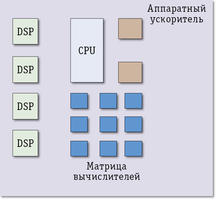Для решения вычислительных задач сегодня применяются различные процессорные архитектуры в сочетании с непрограммируемыми аппаратными узлами: SISD (Single Instruction, Single Data), которые используются как процессоры общего назначения; SIMD (Single Instruction, Multiple Data), предназначенные для операций с векторами данных (например, мультимедийной обработки); MIMD (Multiple Instruction, Multiple Data) – матрицы процессорных элементов. На рис. 3 представлена комбинированная система, содержащая процессоры с различными архитектурами. Такой подход (many core) рассматривается как альтернатива multicore, подразумевающему использование однотипных процессорных ядер. С помощью такой гетерогенной вычислительной среды можно оптимально распределить нагрузку между ядрами. Реконфигурируемость аппаратуры – несомненный плюс, ведь появляется возможность реализовать в каждом процессоре именно те возможности, которые потребуются ему для решения определенного класса задач. Такое свойство недостижимо ни для процессоров общего назначения, ни для графических ускорителей, поскольку они должны содержать все устройства, которые когда-либо могут быть востребованы программистом. Нетрудно представить, как мала эффективность процессора с архитектурой x86, выполняющего операцию суммирования многогигабайтного массива или сравнения двух массивов. Аппаратные затраты на такую операцию в FPGA несопоставимо малы, а узкая применимость задачи неважна, ведь для другой задачи может быть загружена другая конфигурация.