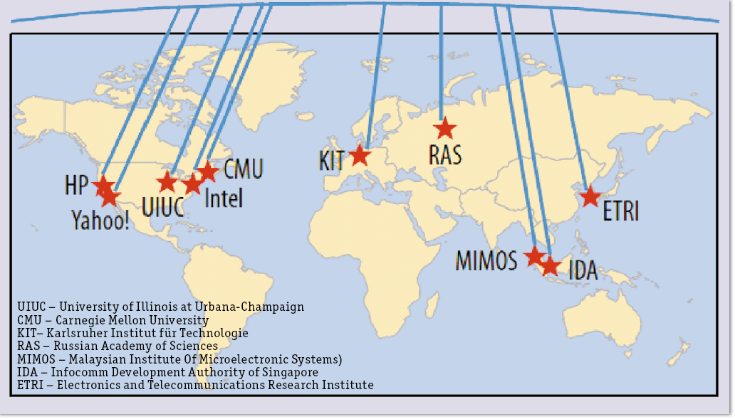 Проект OpenCirrus поддерживается компаниями HP, Intel и Yahoo! при содействии Национального научного фонда США и объединяет разработчиков системного и прикладного ПО из различных научно-исследовательских центров. В 2009-2010 годах к проекту присоединились Университет штата Иллинойс, Технологический институт Карлсруэ, Центр развития информационных и коммуникационных технологий при правительстве Сингапура, Российская академия наук, Исследовательский институт электроники и телекоммуникаций Южной Кореи, Малазийский институт микроэлектронных систем и Университет Карнеги-Меллона. В текущем состоянии стенд OpenCirrus (рис. 1) состоит из 10 узлов (Северная Америка, Европа и Азия). Каждый узел предоставляет доступ к кластерам, содержащим не менее 1000 ядер. Авторизованные пользователи могут получить доступ к любому узлу Open Cirrus, используя одни и те же учетные данные.