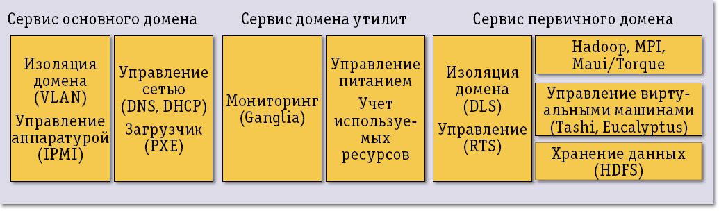 Для поддержки разнообразных потребностей пользователей сервисы первичного домена имеют средства управления виртуальной машиной, обеспечивающие удобный механизм распределения ресурсов для различных пользователей и сервисов. Hadoop, например, реализует парадигму программирования MapReduce и предлагает популярную систему поддержки выполнения для построения облачных сервисов. Другой популярной системой поддержки выполнения, обеспечивающей сервис распределения заданий, является планировщик кластерного времени Maui вместе с распределителем ресурсов Torque. Предоставляя два сервиса через непересекающиеся множества виртуальных машин, администратор первичного домена может динамически корректировать пул ресурсов, доступных каждому сервису в соответствии с его потребностями. Пользователи, для выполнения заданий которых недостаточно возможностей одного из имеющихся сервисов каркаса приложений, могут затребовать свой собственный пул виртуальных машин.