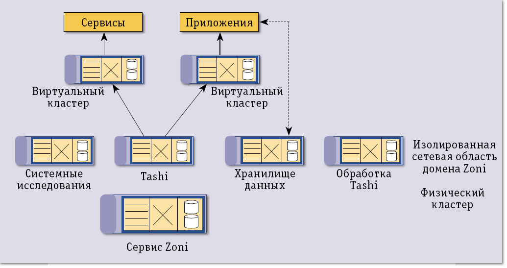 На рис. 3 показан пример сочетания различных сервисов OpenCirrus. Кластер подразделяется на четыре домена. Первый используется для исследования низкоуровневых систем, где исследователи устанавливают собственные ядра ОС и выполняют собственные экспериментальные коды и сервисы. На втором домене выполняется система управления виртуальными машинами, предоставляющая пользователям виртуальные кластеры, которые совместно выполняются на физических узлах в домене Zoni. На этих виртуальных кластерах пользователи строят свои собственные сервисы и приложения. Третий домен обеспечивает специальный сервис хранения, который могут использовать приложения, выполняемые на втором домене. Четвертый домен предлагает «песочницу» для разработки следующих версий Tashi.