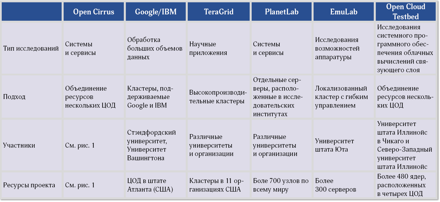 Существующие сегодня стенды облаков можно подразделить на две группы: стенды для исследовательских целей и стенды изучения поведения приложений (см. таблицу). Стенды Google/IBM, TeraGrid и Microsoft Windows Azure поддерживают исследования прикладного уровня, не обеспечивают доступ к аппаратуре на уровне «голого железа» или доступ к ОС с правами администратора. В частности, стенд Google/IBM настроен на сервис Hadoop и направлен на исследование приложений, работающих с большими объемами данных. Стенд TeraGrid – многосайтовая инфраструктура, используемая, в основном, для поддержки научных исследований. Стенд Open Cloud Testbed предназначен для исследования программного обеспечения облачных вычислений связующего слоя и объединяет четыре 32-узловых сайта. Такие стенды, как PlanetLab и Emulab, также разработаны для поддержки системных исследований.