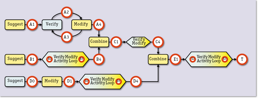 Мыслитель объединяет состоятельные гипотезы, но не все сразу, а каким-то только ему известным порядком, основанным на интуиции, знаниях и опыте. Такие комбинации дают комплексные гипотезы (E1, при этом соответствующие логические конструкции дизъюнктируются), которые в свою очередь модифицируются и проверяются (E2-E3), доходя до окончательного вывода (Т).