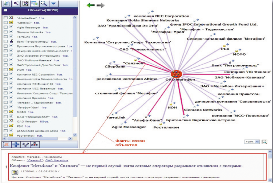 В систему включена функция построения иерархической структуры кластеров фактов с общими свойствами, что позволяет выделять бизнес-группы, группы с общими интересами и др.