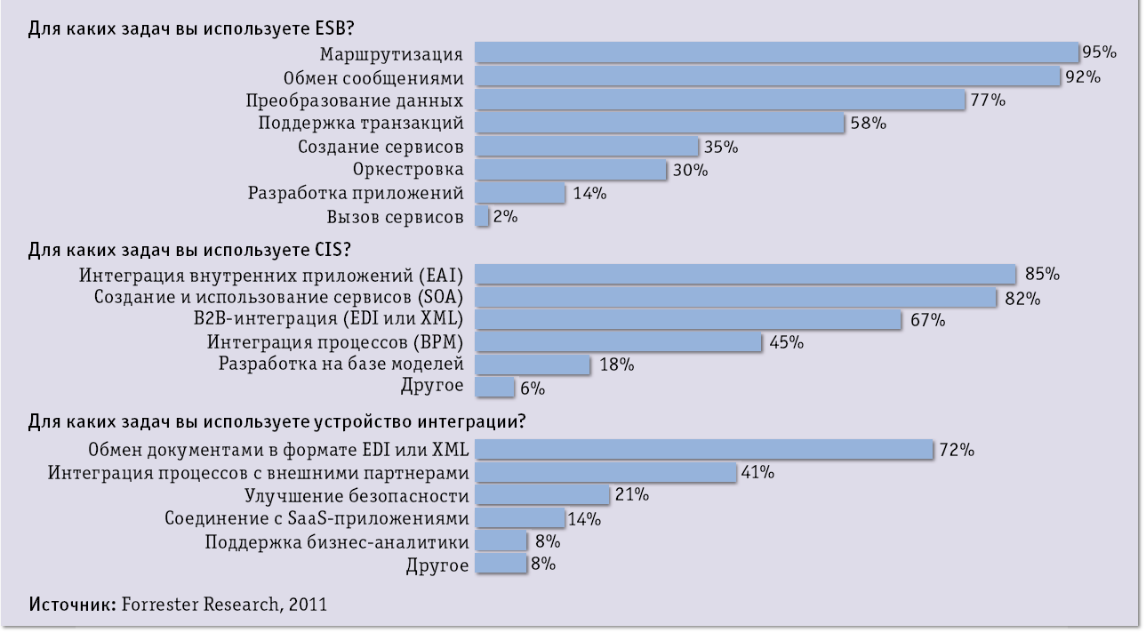В Forrester Research выяснили, что наибольшей популярностью среди инструментов интеграции процессов и приложений на сегодняшний день пользуются сервисные шины предприятия (Еnterprise Service Bus, ESB). Им отдают предпочтение 57% опрошенных аналитиками. На втором месте – комплексные интеграционные решения (Comprehensive Integration Solution, CIS), объединяющие в одном пакете средства интеграции приложений предприятия (Enterprise Application Integration, EAI), интеграции с системами бизнес-партнеров (B2B), управления бизнес-процессами (Business Process Management, BPM) и разработки. Третьими по популярности оказались программно-аппаратные устройства интеграции (integration appliance).
