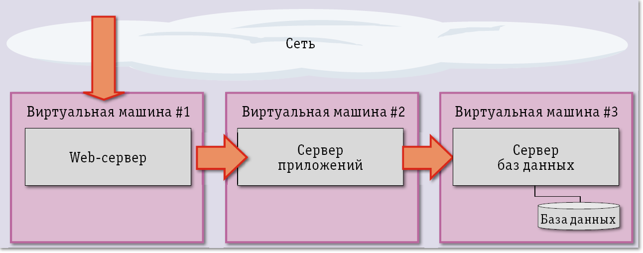 Различие между PaaS и IaaS не очевидно, но крайне важно. Термин PaaS получил широкое распространение позже, чем IaaS, и является логическим развитием исходных идей. Представим разработчика, который пишет обычное корпоративное или веб-приложение, которое выглядеть будет примерно следующим образом: база данных, веб-сервер и сервер приложения. Разработчик пишет приложение, покупает три виртуальные машины, на каждой из которых запускает соответствующий компонент (рис. 2).