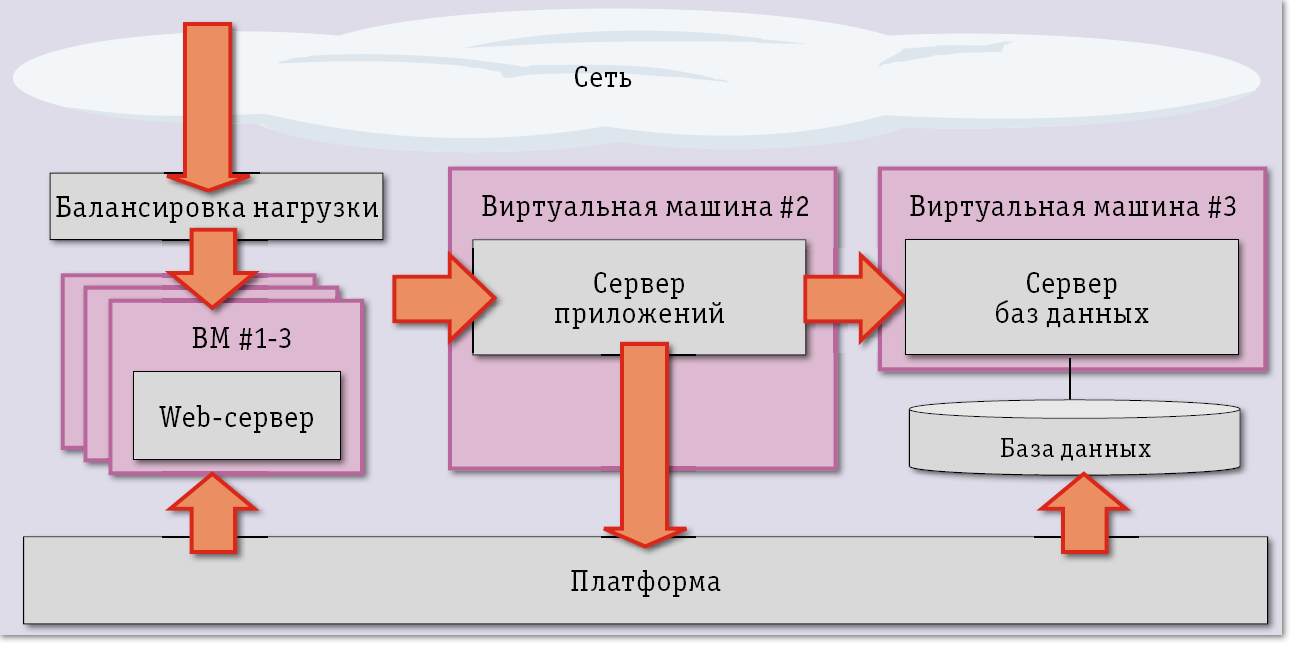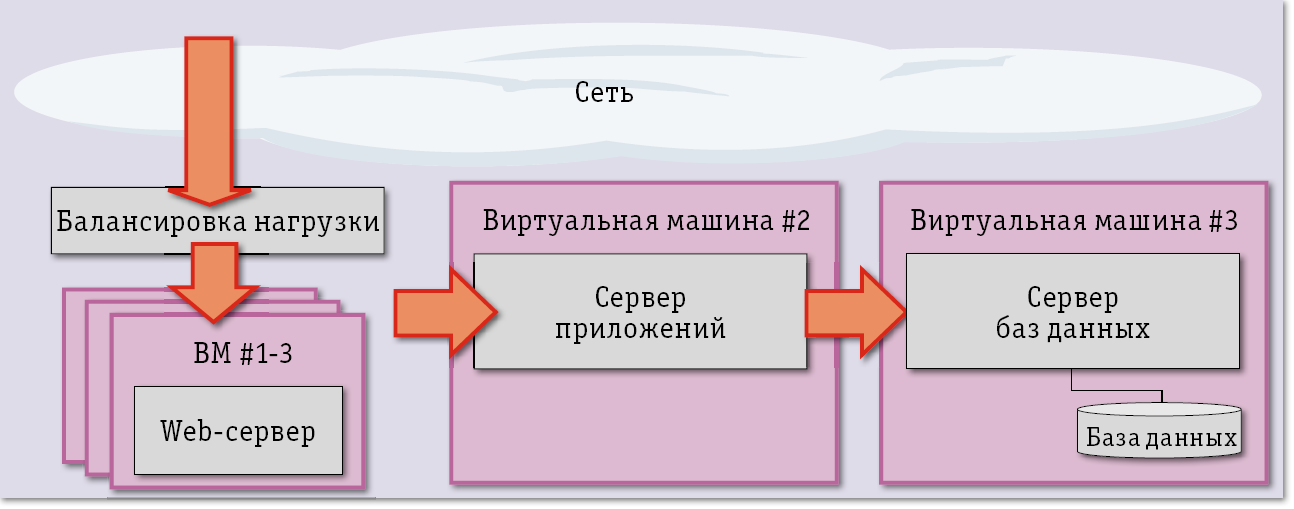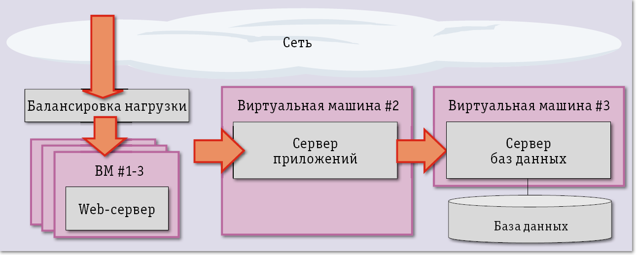 | Рис. 3. Программный балансировщик нагрузки необходим объемным приложениям, для функционирования которых используется несколько виртуальных машин |