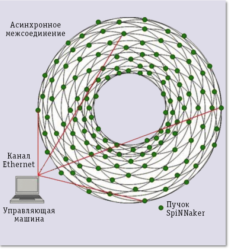 Таким образом, основа проекта SpiNNaker была заложена в те десять лет с 1980-го по 1990 год, когда Стив Фарбер работал в компании Acorn, где руководил разработкой аппаратного обеспечения. Перейдя в Манчестерский университет на должность профессора, Фарбер организовал исследовательскую группу Amulet и сосредоточил свое внимание на создании асинхронных версий ARM. Его коллега профессор Университета Саутгемптон Эндрю Браун не столь известен, его карьера развивалась в обратном направлении, он начал с академических исследований и пришел к практике, создав две компании. Он не специалист в электронике, и его взгляды много шире инженерных. Вот что он написал: «Среди тех, кто занимается электроникой, лишь очень немногие знают о существовании чего-то еще, что не связано с бесконечной гонкой в надежде успеть за экспоненциальным ростом возможностей в соответствии с законом Мура. Но есть предел сложности, он почти достигнут, и больше не нужны устройства, для которых главным критерием является быстродействие. Востребованы уже сейчас и еще больше будут востребованы в будущем разумные устройства, а это значит наступает наше время».