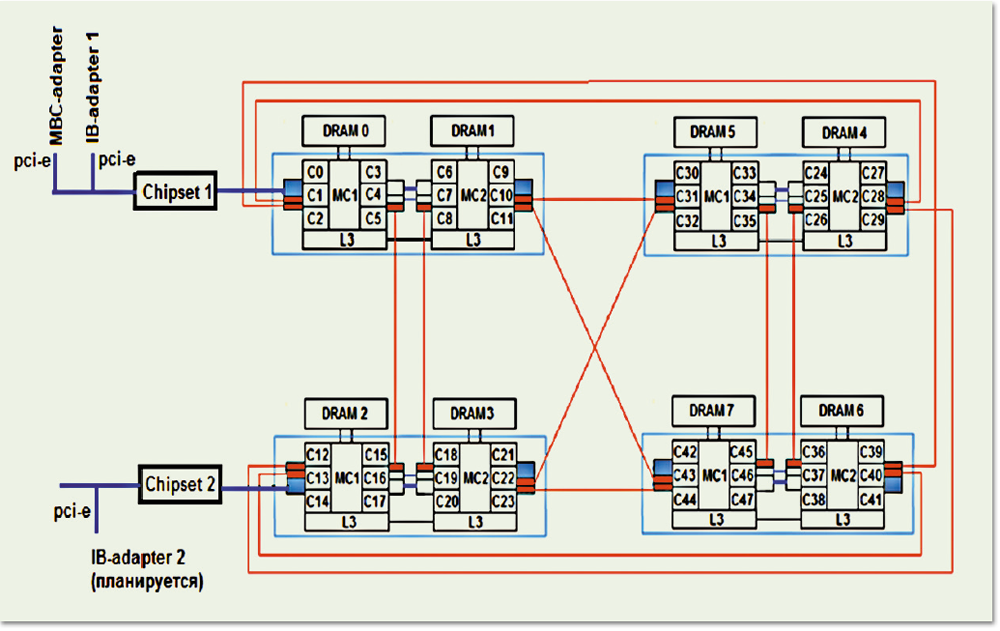 На плате узла ПТК размещаются четыре сокета с процессором MagnyCours в каждом, а внутри сокетов можно выделить чип-сокеты: чип-сокет 0 – ядра С0-С5, чип-сокет 1 – ядра С6-С11,... чип-сокет 7 – ядра С42-С47. MC1 и MC2 – двухканальные контроллеры памяти, DRAM0 – DRAM7 – модули памяти, IB-adapter – адаптеры сети Infiniband, MВС-adapter – адаптер сети «МВС-экспресс». Красные линии между сокетами – 8-разрядные линки HyperTransport c пропускной способностью в одну сторону 6,4 Гбайта/с, пропускная способность одного чип-сокета с модулем памяти – 28,8 Гбайт/с, односторонняя пропускная способность интерфейса PCI-экспресс 2.0 – 8 Гбайт/с, односторонняя пропускная способность линка сети Infiniband QDR – 4 Гбайт/с. Чип-сокеты внутри одного сокета соединены 24-разрядным интерфейсом HyperTransport – 19,2 Гбайт/с. Пиковая производительность одного ядра на скалярных операциях – 8,8 GFLOPS, а всего 12-ядерного микропроцессора – 105,6 GFLOPS.