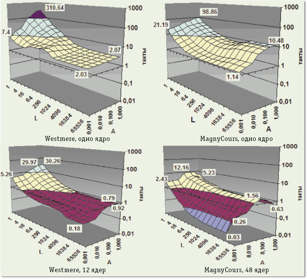 Выбранные четырехсокетные узлы действительно обладают более высокими свойствами толерантности к задержкам выполнения обращений к памяти, чем двухсокетные узлы на процессорах с меньшим количеством ядер. На рис. 2 приведены результаты в виде APEX-поверхностей, полученные на тесте APEX-MAP оценки эффективности подсистемы памяти в разных режимах пространственной (L – «попадание в кэш-строку» и «правильность преднакачки в кэш») и временной (A – «попадание в один и тот же адрес») локализации обращений к памяти. Представлено среднее наблюдаемое тестом количество тактов процессора, за которое происходит одно обращение к памяти, в зависимости от пространственно-временной локализации обращений к ней.