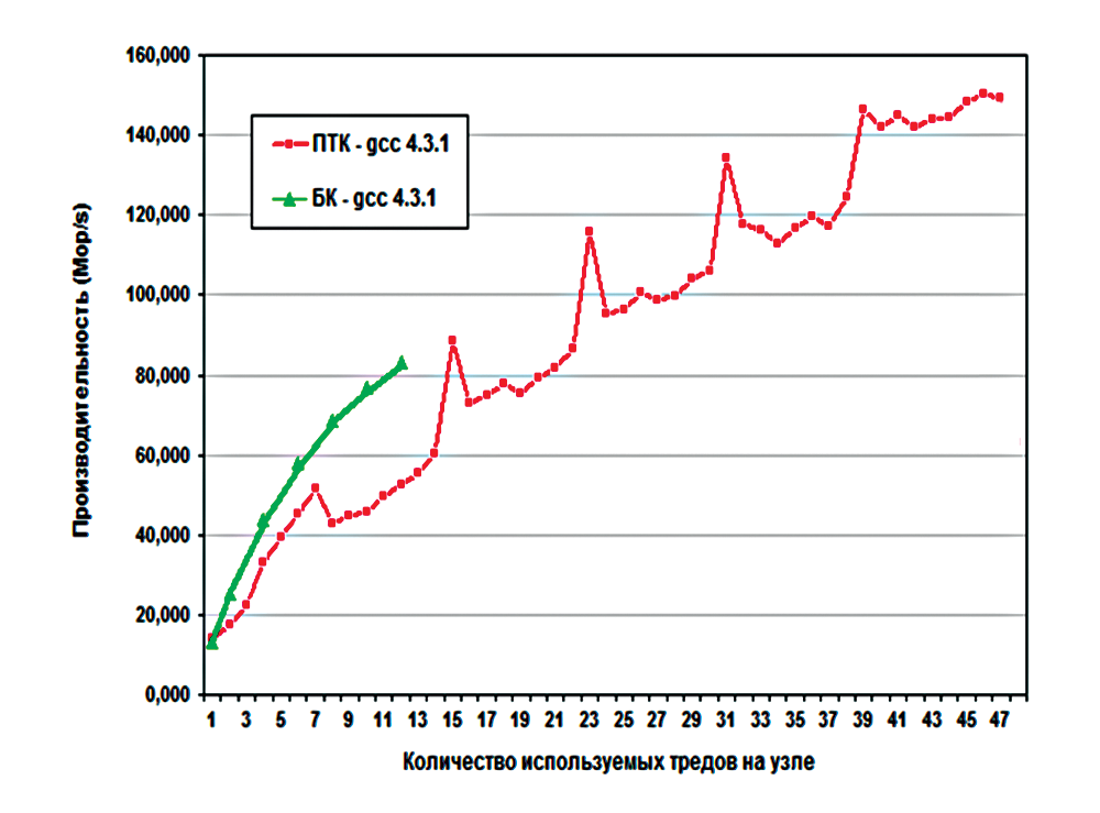 Установлено, что ядро Westmere почти в два раза лучше по производительности, чем ядро MagnyCourse, но ядер в четырехсокетной плате с процессорами MagnyCourse в четыре раза больше, и если удается эффективно использовать до 48 ядер, то в целом одна четырехсокетная плата по производительности оказывается в два-четыре раза лучше, чем двухсокетная. Кроме того, для реализации вычислительных узлов ПТК и БК не на лезвиях это означает пропорциональный выигрыш по габаритам, а также заметный выигрыш по энергопотреблению и стоимости.