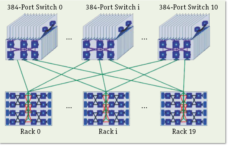 Отправная точка «китайского пути» к петафлопсным системам – суперкомпьютер Tianhe-1A, разработанный в Национальном университете оборонных технологий: пиковая производительность – 4,7 PFLOPS; реальная – 2,5 PFLOPS (70% этой производительности дают графические ускорители); энергопотребление – 4 MВт; 14 336 шестиядерных 12-тредовых процессоров общего назначения Xeon X5670 (Westmere); 7168 графических сопроцессоров nVidia Tesla M2050 (Fermi); 2048 мультитредовых процессоров FT-1000 (китайский усовершенствованный вариант Sun Niagara T2); сеть Arch с топологией «толстое дерево» и выделенными иерархическими уровнями сильной связности (рис. 1), в которой применяются микросхемы китайского производства – сетевой адаптер и 16-портовый маршрутизатор NRC, изготовленные по технологии 90 нм.