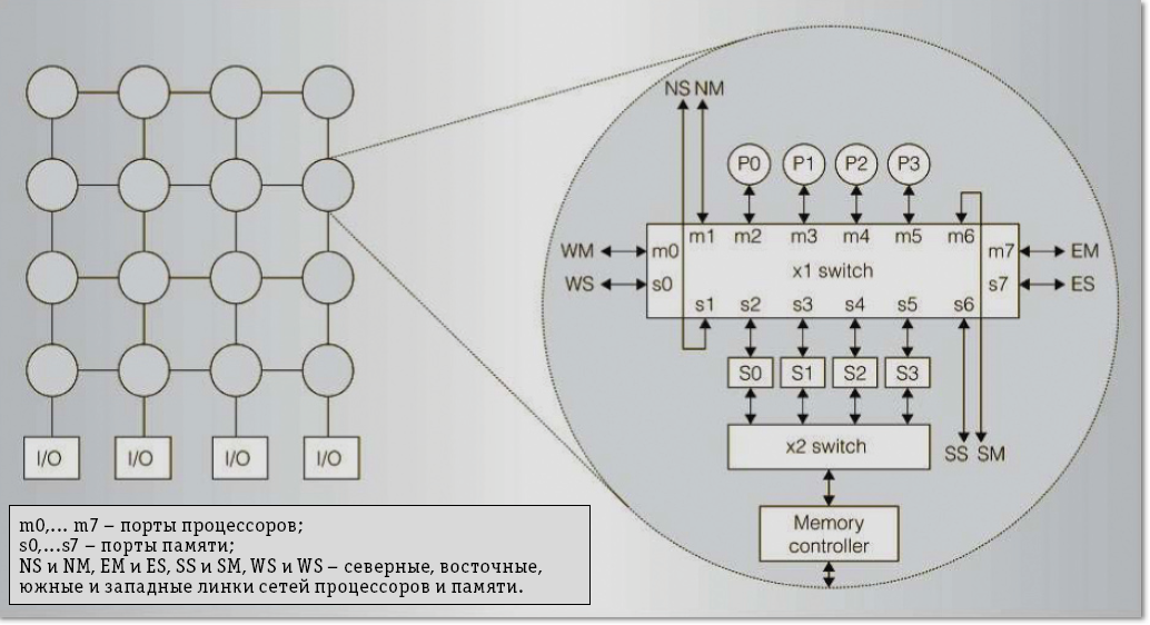 Базовые решения – выбор 16-сокетной платы, а микропроцессор в сокете должен в конечном итоге содержать 2D-решетку из 16 тайлов (узлов). В каждом тайле (рис. 2): четыре суперскалярных процессорных ядра P0, P1, P2 и P3; блоки разделяемого кэша L2 – S0, S1, S2 и S3 объемом 1 Mбайт каждый; коммутатор соединения процессоров с кэшем L2 и соседними тайлами во внутрикристальной сети (коммутатор x1); коммутатор для подключения к контроллеру памяти (коммутатор x2). Внутрипроцессорная сеть между тайлами 128-разрядная, двойная (передача данных процессоров и памяти), работает на частоте процессора. Обеспечивается кэш-когерентность – все блоки кэша L2 тайлов процессора могут рассматриваться как единый кэш L2.