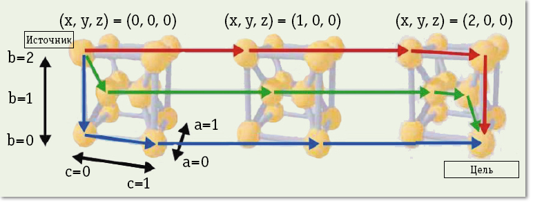 Сеть Tofu (рис. 3) – иерархическая, с сильными связями на нижнем уровне иерархии. Три измерения (а, b и с) – это пространство внутри макроузла (узловой группы), в которой 12 вычислительных узлов связаны сетью «гиперкуб». Каждый узел макроузла имеет соединения в сети 3D-тор, а макроузел в целом – координаты (x, y и z). На рис. 3 показаны три таких макроузла с координатами в сети 3D-тор – (0, 0, 0), (1, 0, 0) и (2, 0, 0). Таким образом, можно считать, что один макроузел, на самом деле входит в 12 сетей с топологией 3D-тор.