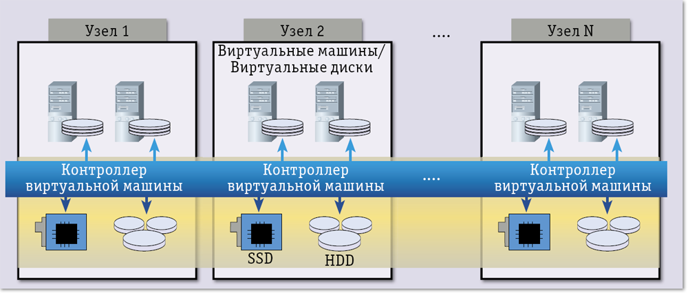 Проблема адаптации к динамической среде решается встроенными функциями, играющими роль своего рода гипервизора, который строит виртуальную сеть хранения из подключенных к отдельным серверам систем хранения данных, состоящих из двух типов накопителей (SSD и HDD), именно гипервизор обеспечивает миграцию VM и высокую готовность. Он же преодолевает ограничения традиционных систем хранения, которые оптимизированы на работу с физическими серверами, а именно привязанность виртуальной машины к определенным логическим номерам устройств. Если один логический номер привязан к нескольким VM, то затрудняется выполнение операций резервного копирования, создания моментальных снимков и восстановления после сбоев, в условиях привязки к отдельной VM, а также определение мест, где теряется производительность из-за сильной связанности компьютерной части системы с иерархической системой хранения. Что же касается второй проблемы, связанной со сложностями включения SSD в систему, то здесь дело даже не в низкой скорости HDD по сравнению с SSD, а в присущей вращающимся дискам задержке. Для компенсации задержки требуется специальная архитектура, например RAID, и специальное ПО, а прямая замена HDD на SSD малоэффективна потому, что инфраструктура оптимизирована для вращающихся носителей. Простой перенос ПО для HDD на работу с SSD, где нет задержки, поскольку нет вращения, также не дает заметного ускорения. Архитектура и программное обеспечение Nutanix созданы специально под SSD с учетом частоты использования любых данных, в том числе и метаданных, позволяющих оптимальным образом резервировать и использовать пространство хранения, а также организовать миграцию данных по уровням хранения в зависимости от актуальности («горячие» — на SSD, «холодные» — на HDD).