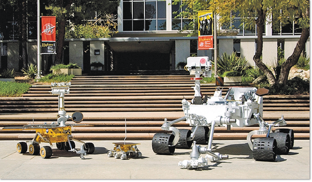 | Рис. 2. Эволюция марсоходов. Слева направо: один из двух марсоходов 2004 года – Spirit и Opportunity; марсоход Pathfinder 1997 года и марсоход Curiosity 2011 года (фотография NASA/JPL-Caltech) |