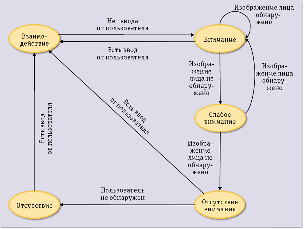 Авторы статьи разработали схему, улучшающую выявление намерений пользователей посредством обнаружения состояний пользовательского присутствия за дисплеем на основе изображений, получаемых с веб-камер. Это позволяет определить, например, внимателен пользователь или дремлет, а чтобы избежать ложного выявления намерений, было введено промежуточное состояние — «слабое внимание», приводящее к тому, что алгоритм анализа изображения лица пользователя начинает чаще анализировать новое изображение (рис. 3).