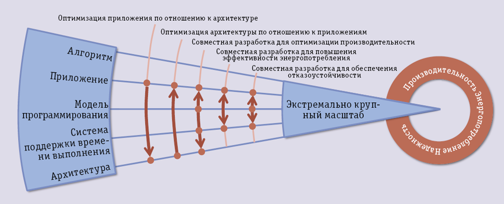 Для оптимизации триады «производительность — потребляемая энергия — надежность» требуется переосмыслить алгоритмы, модели программирования и аппаратную архитектуру, а для этого нужно добиться невиданного уровня сотрудничества в области совместной разработки аппаратных средств, системных архитектур, системного ПО и приложений. Необходим совершенно новый подход, основанный на одновременном проектировании и разработке всех уровней систем с использованием согласованного набора параметров и точных количественно оцениваемых методологий.