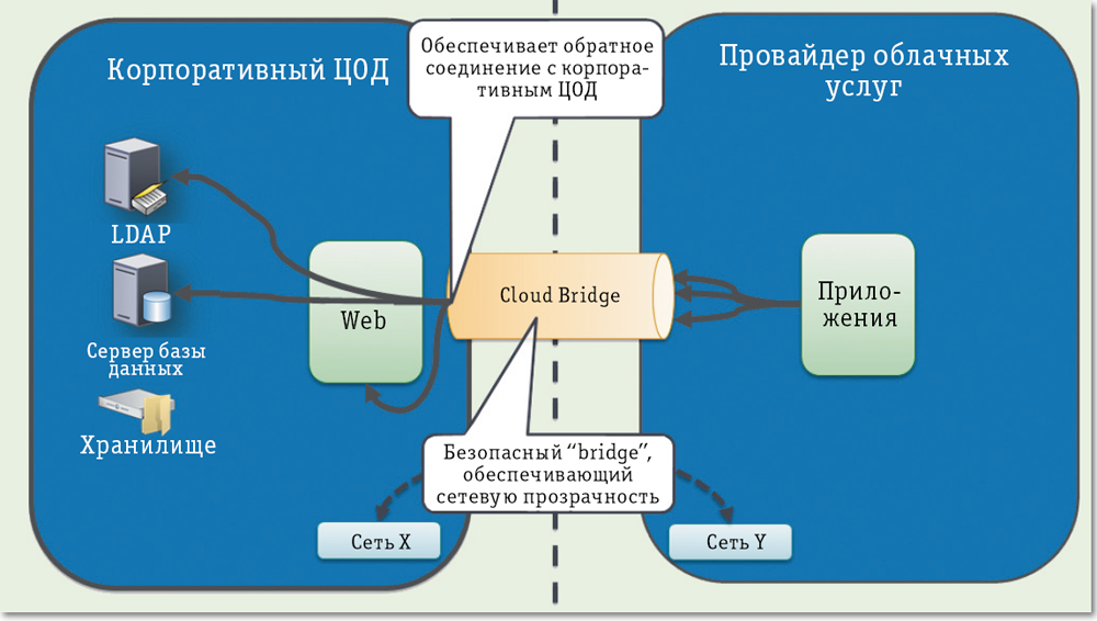 | Рис. 3. Гибридное облако с организацией «прозрачного» соединения между корпоративным ЦОД и ЦОД провайдера |