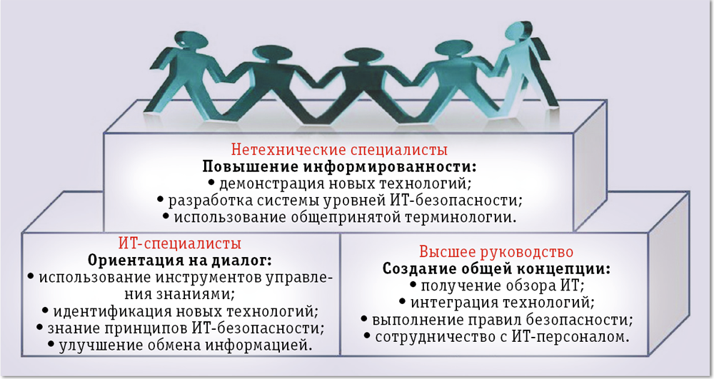 К сожалению, во многих ведомствах только директор по безопасности информационных систем или директор управления информационной безопасностью имеет глубокие познания в соответствующей области. ИТ-специалистам государственных учреждений требуется дополнительное обучение в сфере нормативных актов, правил и рекомендаций по поводу ИТ-безопасности. ИТ-специалист, регулярно общающийся с чиновниками и знающий текущие и будущие потребности своей организации, должен вести непрерывный диалог с экспертом по ИТ-безопасности. Тот, в свою очередь, изучает технические средства для выполнения требований безопасности, предугадывая предстоящие запросы со стороны руководства.