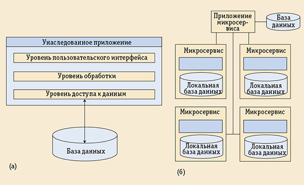 Рис. 1. Сравнение (a) унаследованной (монолитной) архитектуры и (б) архитектуры микросервисов |
