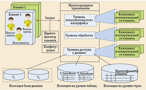 Мультиарендное приложение, предлагаемое в качестве сервиса, позволяет удовлетворить потребности сразу нескольких групп пользователей, организаций или подразделений. При использовании мультиарендной модели на уровне приложения каждый из его экземпляров обслуживает сразу несколько клиентов. Экземпляры конфигурируются с учетом потребностей арендаторов. При совместном использовании экземпляров приложения данные арендаторов должны быть отделены друг от друга и доступны только их владельцам (рис. 2). Помимо разделения клиентских данных, мультиарендная среда должна обеспечивать равномерное распределение вычислительных ресурсов между арендаторами. В этом случае возрастание спроса на ресурсы со стороны одного арендатора не отражается негативным образом на всех остальных.