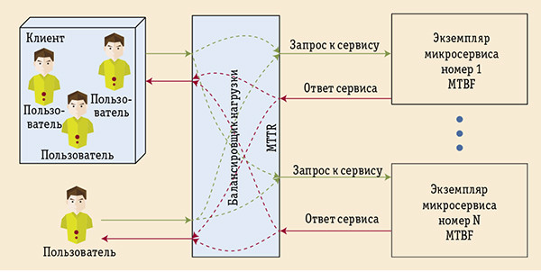 Готовность = MTBF / (MTBF + MTTR), где MTBF (mean time between failures) — средний промежуток времени между отказами, а MTTR (mean time to repair) — среднее время восстановления. Предположим, что все экземпляры микросервисов имеют одинаковый параметр MTBF, тогда готовность системы возрастает при снижении MTTR. Этого можно достичь за счет предоставления балансировщику нагрузки возможности останавливать переадресацию входящих клиентских запросов сбойным экземплярам микросервиса и направлять их нормально функционирующим экземплярам. Балансировщик нагрузки способен немедленно направлять запросы уже развернутым избыточным микросервисам только в том случае, если они не зависят от состояния.
