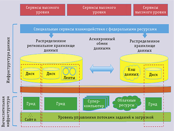 За основу архитектуры российского озера научных данных был взят опыт НИЦ «Курчатовский институт», ОИЯИ и СПбГУ, полученный при создании прототипа распределенного федеративного хранилища данных [3]. Однако сегодня ландшафт ресурсов заметно изменился: возросла роль суперкомпьютеров при решении большого числа однородных задач (ранее речь шла о выполнении больших канонических приложений, таких как моделирование климата, квантовой хромодинамики, материаловедения); выросла специализация — например, для приложений физики высоких энергий используются только вычислительные ресурсы МИФИ, ИТЭФ, НИИЯФ и МГУ, а для ряда других задач применяются специализированные центры (ВЦ МГУ, ВЦ РАН, СКИФ) и крупные центры обработки и хранения данных (НИЦ КИ, ОИЯИ). Изменился и масштаб коммуникаций: крупнейшие центры России теперь связаны с европейскими исследовательскими центрами (ЦЕРН, DESY, GSI) через академические высокоскоростные вычислительные сети (LHCOPN, LHCONE, Geant, NorduNet), в которых нижний уровень передачи данных обеспечивается сервисом FTS (File transfer service — стандарт де-факто передачи данных экспериментов БАК). При создании распределенной гетерогенной вычислительной инфраструктуры в новых условиях возник ряд проблем, связанных с иерархией хранения информации, гетерогенностью компьютерных ресурсов, необходимостью перемещения огромных массивов данных и управления ими, а также с обеспечением единого пространства имен.