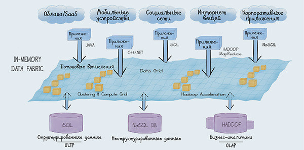 Apache Ignite может работать локально, в облаке или в гибридной среде. Единый API позволяет интегрировать облачные приложения и хранилища со структурированными, квазиструктурированными и неструктурированными данными — все это возможно благодаря поддержке SQL, .Net, C++, Java, Groovy, Scala, PHP и Node.js. Платформа имеет интерфейсы с СУБД MySQL, Oracle, DB2, PostgreSQL, MS SQL Server и другими реляционными базами, генерируя модель домена приложения, основанную на определении схемы базы данных с последующей загрузкой данных. Кроме поддержки интерфейса ANSI SQL-99, Ignite работает с хранилищами «ключ-значение» и MapReduce, обеспечивая поддержку потоковой и массово-параллельной обработки данных, вилочного параллелизма (чередование последовательно и параллельно исполняемых участков кода) и обработку сложных событий, кластеризацию и ускорение Hadoop. Таким образом, не требуется замена существующих баз данных — данные можно переносить в оперативную память из различных источников, что важно для компаний, работающих с большими массивами данных, но неготовых к радикальной перестройке своей ИТ-инфраструктуры.