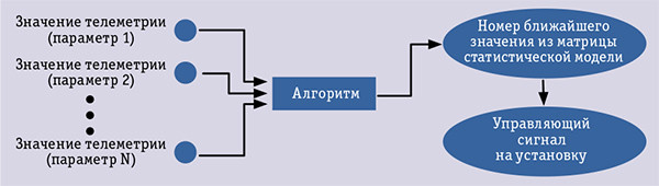 Для динамического контроля за работой производственных установок можно предложить программный комплекс, действующий в полностью автономном режиме и визуализирующий информацию о режиме работы оборудования и программного комплекса. Основной режим работы такого комплекса — определение значения из матрицы статистической модели оборудования, ближайшего к текущим показаниям телеметрии. Такая матрица нормальных значений показаний телеметрии может быть получена непосредственно от производителя оборудования, а если решается задача управления установкой, то необходимо будет составить эту матрицу непосредственно на предприятии исходя, например, из конкретных операционных карт. Для этого в заданные интервалы времени считываются показания телеметрии установки, которые затем подаются на вход алгоритма, выбирающего с помощью непараметрического метода k-ближайших соседей (K-nearest neighbors algorithm) [2] наиболее близкое значение из матрицы статистической модели оборудования. На основании этого значения устанавливается указанный режим работы или запускается последовательность операций установки. Если количество записей в матрице превышает число режимов работы оборудования, то эти записи группируются и устанавливается отношение «многие-к-одному». Таким образом достигается автоматическое управление на дискретном пространстве операций.