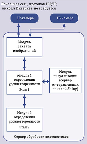 Сервер обработки видеопотоков автономно размещается либо в защищенном периметре локальной вычислительной сети МФЦ, либо без доступа к локальным ресурсам. В системе сохраняются только данные по измеренному уровню удовлетворенности и используется лишь открытое ПО, поэтому применения дополнительных мер для обеспечения защиты информации не требуется. Для построения интерактивных панелей визуализации уровня удовлетворенности посетителей МФЦ используется фреймворк Shiny для языка R (www.rstudio.com/products/shiny), позволяющего применять внешние инструменты анализа данных и через веб-приложения выводить результаты работы (например, для организации удаленной оценки работы конкретного МФЦ).