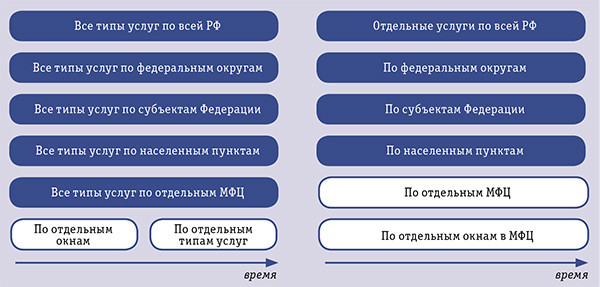 На рис. 2 приведена структура иерархии интерактивных панелей системы анализа удовлетворенности граждан получением услуг в МФЦ, которая позволяет анализировать ситуацию на уровне федеральных округов, регионов, населенных пунктов и конкретных МФЦ, причем как в целом по всем услугам, так и по их отдельным типам. Основная вкладка интерактивной панели включает общую агрегированную информацию по всей стране, а наиболее важные показатели выводятся на отдельные панели. Общий обзор уровня удовлетворенности граждан качеством услуг отображается на географической карте, что позволяет выявить территориальные различия. Интерактивность этой карты обеспечивает детальный анализ по уровням агрегации в соответствии с административно-территориальным устройством: РФ — субъект РФ — объекты административно-территориального деления — муниципальные образования. Выбор определенного уровня позволяет ограничить визуализацию — можно выводить только данные по уровню удовлетворенности граждан в МФЦ, находящихся в пределах выбранной территории.