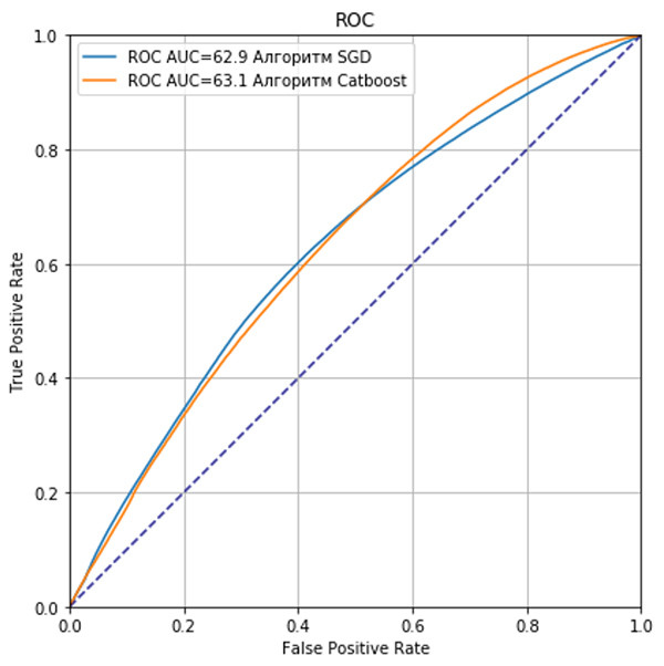 | Рис. 1. ROC-кривые для моделей SGD и Catboost. Штриховая линия — ROC-кривая для случайного классификатора |
