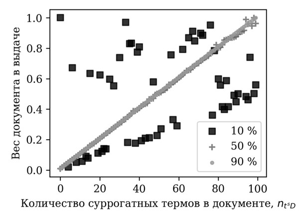 Однако в случае использования других ранжирующих функций — TFIDF L1, TFIDF L2, BM25L, где используется нормализация [4], — указанная связь между числом искомых термов в документе и его позицией среди результатов пропадает. Так как документы имеют различную длину, нормирование ранжирующей функции приводит к искажению порядка выдачи: вместо линейной зависимости веса от количества суррогатных термов возникает разброс значений, вес документов с большим количеством термов оказывается низким (ниже линии TFIDF), а высокие значения веса получают только некоторые документы с малым количеством искомых термов. Для пользователя это означает непредсказуемую сортировку результатов поиска.