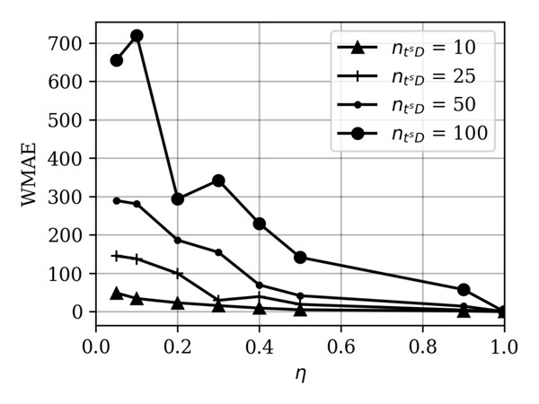 | Рис. 3. Зависимость WMAE от доли доступных документов коллекции при разном распределении суррогатных термов по документам коллекции (числе документов с суррогатным термом ntsD) |