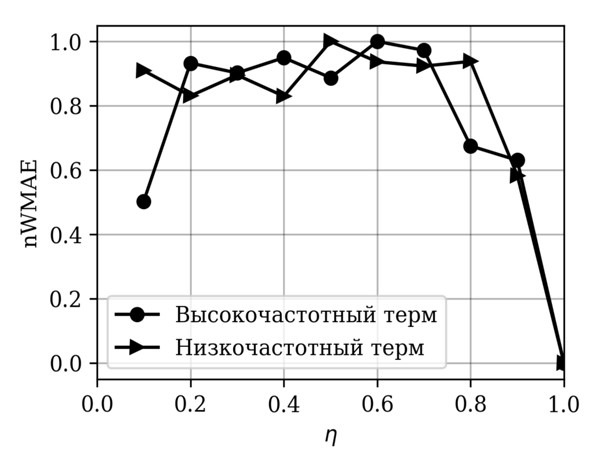 В рамках третьего эксперимента проводился поиск по термам, содержащимся в документах исходной коллекции D (без добавления суррогатных термов). Распределение Ципфа [5] «ранг — частота» для коллекции D было поделено на два промежутка: высокочастотные и низкочастотные термы (граница проходила по значению ранга терма, равному 5000, при общем словаре коллекции около 10 000). Из каждого промежутка выбиралось одинаковое количество случайных термов, и по ним проводилась серия поисковых запросов: одинаковое число для высокочастотных и низкочастотных термов. После этого для различных значений μ (доли доступных документов) была вычислена нормированная версия метрики nWMAE, а затем результат был усреднен. Полученная зависимость средней ошибки релевантности от строгости ограничений показана на рис. 4: видно, что нарушения при сортировке результатов поиска начинаются уже при сокращении доли доступных документов до 80%. Это подтверждает высказанную гипотезу о пороговом характере влияния подокументного доступа на релевантность результатов корпоративного поиска.